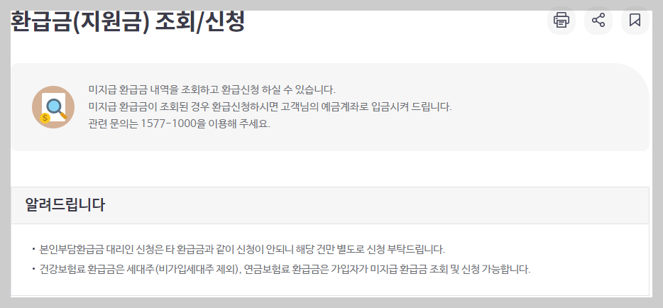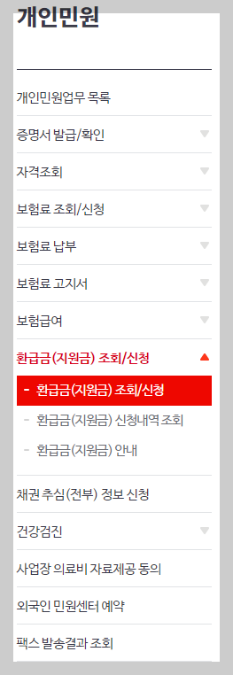 국민 건강보험 환급금 조회 및 신청 방법은 국민건강보험공단 홈페이지에서 가능합니다. 간편 인증도 가능하니깐 인증을 통해 로그인을 하시고 환급금(지원금) 조회/신청으로 들어가시면 됩니다.
