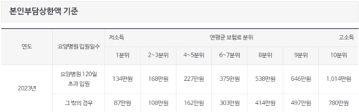 소득을 10개구간으로 나누게 되는데, 소득이 가장 적은 1분위에 속하는 사람은 연간 최대 87만원, 소득이 가장 많은 10분위에 속하는 사람은 연간 최대 780만원까지 부담하면 나머지 병원비는 겅강보험공단에서 돌려주게 됩니다.