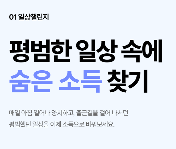 해당 내용은 걸을 때마다 소득으로 바꿀 수 있고, 매일 하는 양치, 식사, 휴식 등 평범한 일상 습관으로도 소득으로 바꿀 수 있습니다. 챌린지에 성공하게 되면 카페, 편의점, 피자, 치킨, 베이커리 등 먹거리 및 영화관, 마트 등 다양한 제휴점에서 현금처럼 사용할 수 있습니다.