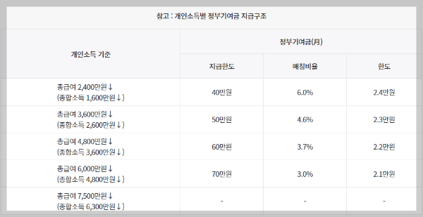 청년계좌의 경우 연소득별 지원 방식에 차등을 두고 있으니, 아래 개인소득별 지원금을 확인하시길 바랍니다.