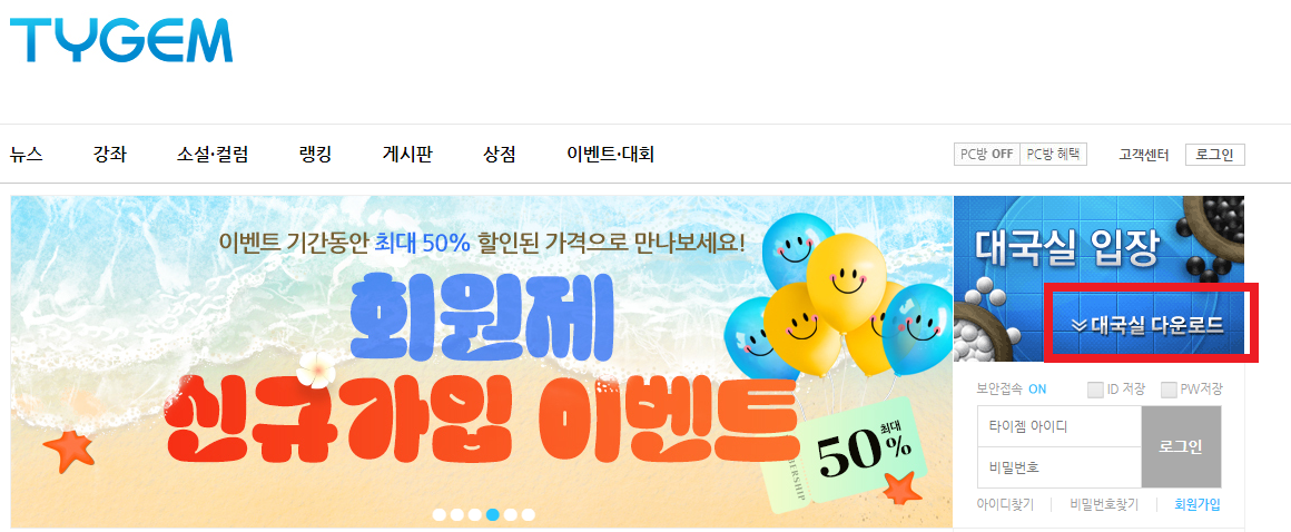 먼저 타이젬 홈페이지에 접속하셔서 타이젬 바둑을 다운로드합니다. 빨간색 네모 박스를 눌러주면 다운로드가 시작됩니다.